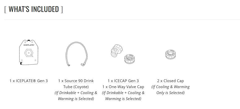 ICEPLATE® Gen 3(旗艦補水解決方案)隨附 Source90 飲水管,並與 CamelBak® 等水袋相容。於搭配防彈背心或背心使用時,建議與 IMS 系列(IMS Pro Gen 3 或 ICEPLATE® Backpack Gen 3)一同使用,以確保最佳效能。