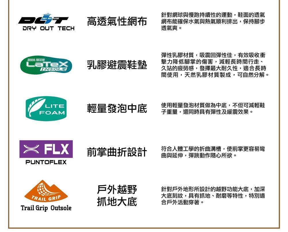 - 大底刻紋深度約5mm,能深入泥土及沙礫,加強抓地力,讓步伐更加輕鬆穩固。